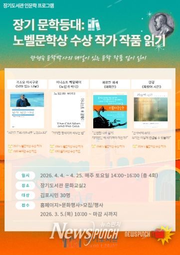 뉴스펀치 박상훈 기자 | 김포시 장기도서관은 인문학 프로그램 ‘장기 문학등대: 노벨문학상 수상 작가 작품 읽기’를 오는 4월 4일부터 4월 25일까지 매주 토요일 오후 2시에 장기도서관 문화교실2에서 운영한다고 밝혔다.