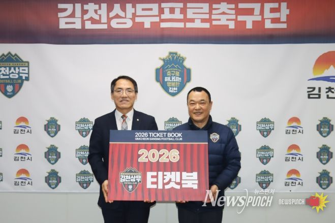 김천상무프로축구단(대표이사 이재하)이 2월 26일, NH농협 김천시지부(지부장 장문석)와 김천시체육회(회장 최한동)의 티켓북 구매 행사를 진행했다. NH농협 김천시지부와 김천시체육회는 티켓북 구매를 통해 다가오는 홈 개막전을 비롯한 김천상무 홈경기 흥행에 앞장선다.