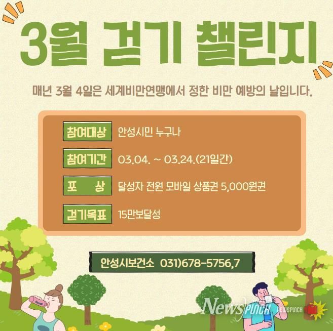 뉴스펀치 박상훈 기자 | 안성시보건소는 오는 3월 4일부터 모바일 걷기앱 ‘워크온’에서 비만예방의 날(3월 4일)을 맞이하여 비만에 대한 인식개선 및 건강생활실천 분위기 조성을 위하여 걷기챌린지를 운영한다.