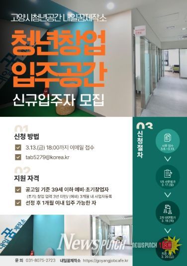 뉴스펀치 박상훈 기자 | 고양특례시는 고양시 청년공간 내일꿈제작소 A동 2층에 조성된 청년창업 입주공간(3개소/7.4㎡~16.1㎡) 신규 입주자를 모집한다고 27일 밝혔다.