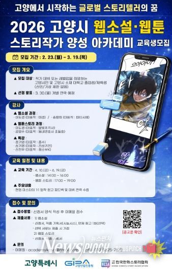뉴스펀치 박상훈 기자 | 고양산업진흥원이 웹콘텐츠 산업을 이끌어갈 스토리 전문 인재 발굴을 위한 ‘2026 고양시 웹소설·웹툰 스토리작가 양성 아카데미’ 교육생을 모집한다.