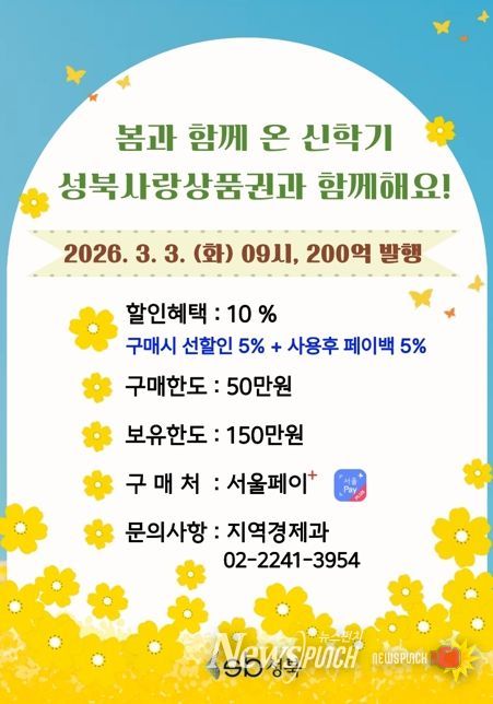 뉴스펀치 박상훈 기자 | 서울 성북구가 다가오는 신학기를 맞아 가계 부담 완화와 지역 소상공인 매출 증대를 위해 오는 3월 3일(화) 오전 9시부터 200억 원 규모의 ‘성북사랑상품권’을 발행한다.