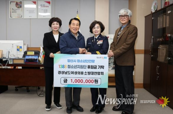 뉴스펀치 박세훈 기자 | 경상남도 여성의용소방대연합회(회장 김복야)는 27일 양산시를 방문해 후원금 100만원을 양산시청소년상담복지센터 1388청소년지원단에 기탁했다.