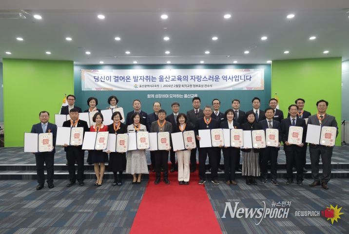 뉴스펀치 김윤걸 기자 | 울산광역시교육청은 27일 오전 10시 외솔회의실에서 2026년 2월 말 정년퇴직자 등을 대상으로 ‘퇴직 교원 정부포상 전수식’을 열었다.