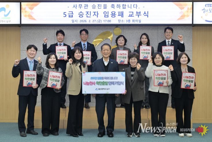 뉴스펀치 김윤걸 기자 | 울산 남구는 5급 승진리더과정 교육에서 복귀한 승진임용 사무관 12명이 관내 위기가정 지원을 위해 나눔천사‘착한출발(매월 1만원 이상 정기기부)’가입에 함께 동참했다고 밝혔다.