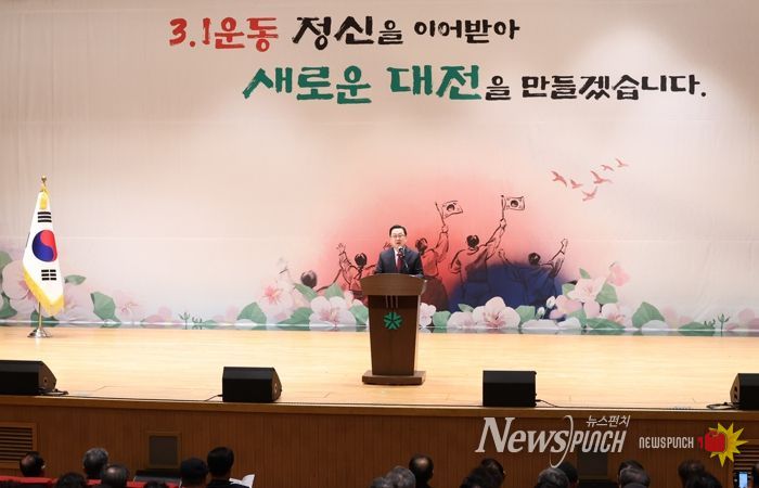 뉴스펀치 이현승 기자 | 대전시는 3월 1일 오전 10시 30분 시청 대강당에서 제107주년 3‧1절 기념행사를 개최하고, 조국 독립을 위해 헌신한 순국선열과 애국지사들의 숭고한 희생과 애국정신을 기렸다.