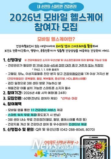 뉴스펀치 이현승 기자 | 대전 중구는 오는 3월 말까지 공공형 건강관리 서비스인 '모바일 헬스케어' 사업 참여자 60명을 선착순 모집한다고 밝혔다.