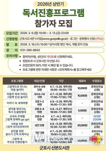 뉴스펀치 박상훈 기자 | 군포시 산본도서관이 2026년 상반기 유아부터 성인까지 참여할 수 있는 독서진흥프로그램을 운영하고, 이에 앞서 참가자를 모집한다.
