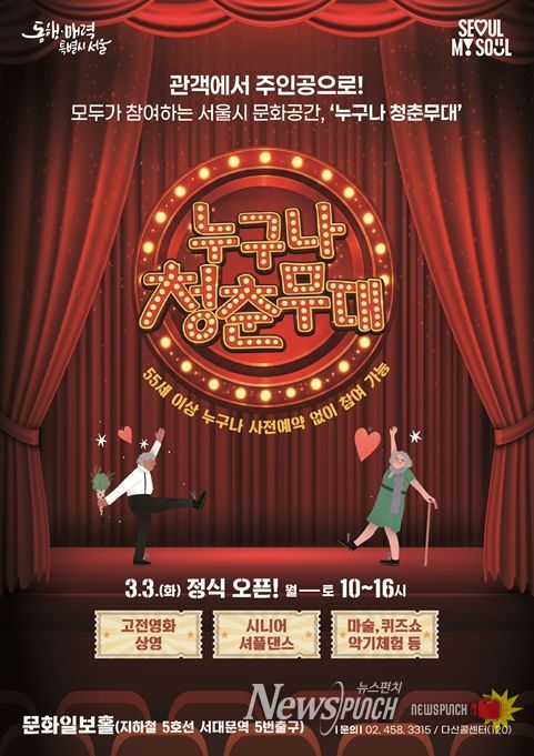 뉴스펀치 박상훈 기자 | 서울시는 어르신들이 편하고 즐겁게 머물 수 있는 문화쉼터 ‘누구나 청춘무대’를 3일부터 정식 운영한다고 밝혔다. ‘누구나 청춘무대’는 55세 이상 어르신이면 누구나 무료로 공연과 영화를 관람하고 다양한 체험 프로그램에 참여할 수 있는 열린 문화공간이다.