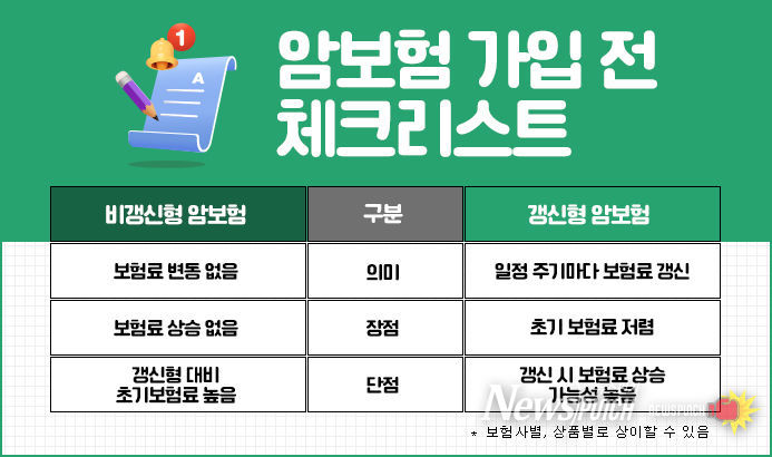 보험료 부담을 줄이려다 보면 저렴한 암보험을 찾게 마련인데 이때 암보험이 갱신형인지 비갱신형인지도 확인할 필요가 있다. 갱신형 암보험은 처음 납입하는 보험료가 저렴하게 느껴지지만 갱신을 할수록 보험료가 계속 높아질 수 있다. 반면 비갱신형은 초기 보험료는 갱신형보다 비싸게 느껴질 수 있지만 앞으로 오르지 않는다는 장점이 있으므로 갱신형 보험보다는 유지 면에서 유리하다. 개인의 소득과 생활패턴, 연령이 다르므로 암보험 갱신형과 비갱신형 중 선택을 하기 전 이러한 차이를 잘 알아두고 본인에게 가장 적합한 것을 고르는 것이 좋다.