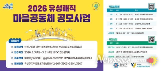 뉴스펀치 이현승 기자 | 대전 유성구는 오는 31일까지 ‘2026년 유성매직 마을공동체 활성화 공모사업’에 참여할 공동체를 모집한다.