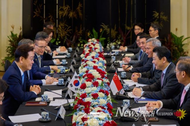 뉴스펀치 김용희 기자 | 싱가포르를 국빈 방문 중인 이재명 대통령은 3월 2일 오전 '로렌스 웡(Lawrence Wong)' 싱가포르 총리와 정상회담을 갖고 양국 간 전략적 동반자 관계 심화 방안과 한반도 및 중동정세 등 주요 국제 현안에 대해 폭넓게 논의했다.