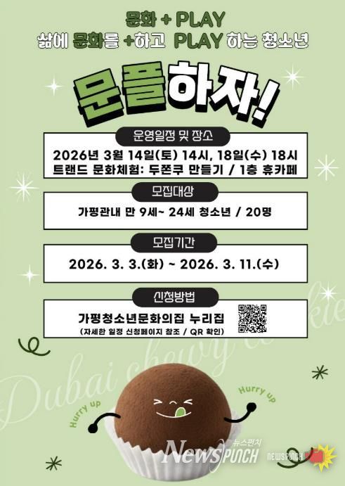 ‘문플(문화+PLAY)’은 ‘삶에 문화를 더하고 즐기는 청소년’이라는 주제로 청소년들에게 다양하고 폭넓은 문화 활동을 제공하는 프로그램이다. 이번 3차 프로그램은 ‘트렌드 문화체험: 두쫀쿠 만들기’로 진행된다.