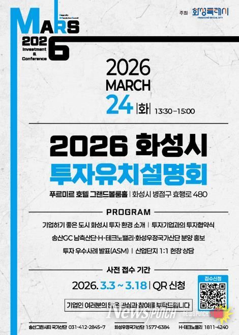 뉴스펀치 박상훈 기자 | 화성특례시가 오는 3월 24일 푸르미르 호텔에서 ‘2026 화성특례시 투자유치 설명회’를 개최하고, 3월 3일부터 3월 18일까지 QR코드를 통한 사전접수를 진행한다.