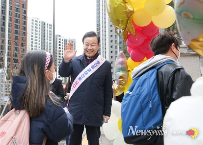 뉴스펀치 박상훈 기자 | 김성제 의왕시장이 3월 3일 의왕푸른초등학교의 개교를 맞아 학생들의 첫 등교를 축하했다.