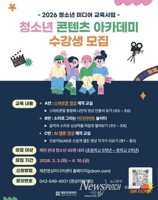 뉴스펀치 이현승 기자 | 제천문화재단은 2026년 청소년 영상제작 교육사업'청소년 콘텐츠 아카데미'를 운영하고 수강생을 모집한다.