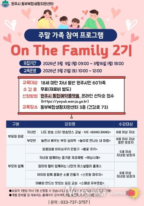 뉴스펀치 조평훈 기자 | 원주시 동부복합생활지원센터는 오는 21일 주말 가족 참여 프로그램 ‘온 더 패밀리(On The Family)’ 2기 과정을 운영한다.