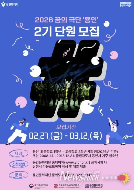 뉴스펀치 박상훈 기자 | 용인문화재단은 2월 27일부터 3월 12일까지 '2026 꿈의 극단 ’용인’' 2년차 사업에 함께할 신규 단원을 모집한다.