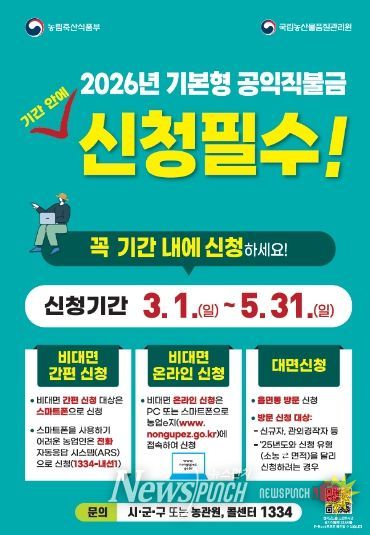 뉴스펀치 강영선 기자 | 금산군 농업·농촌의 공익기능 증진과 농업인의 소득 안정을 위한 2026년도 기본형 공익직접지불금 등록을 오는 5월 31일까지 접수한다.
