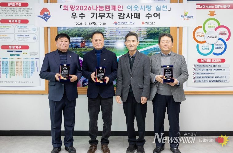 뉴스펀치 김윤걸 기자 | 부산 북구는 희망2026나눔캠페인 기간 이웃사랑 실천에 앞장선 우수 기부자에게 부산사회복지공동모금회(회장 이수태) 감사패를 수여했다고 밝혔다.