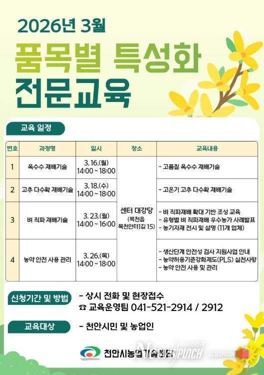 뉴스펀치 강영선 기자 | 천안시농업기술센터는 본격적인 영농철을 앞두고 ‘품목별 특성화 전문교육’을 운영한다고 6일 밝혔다.