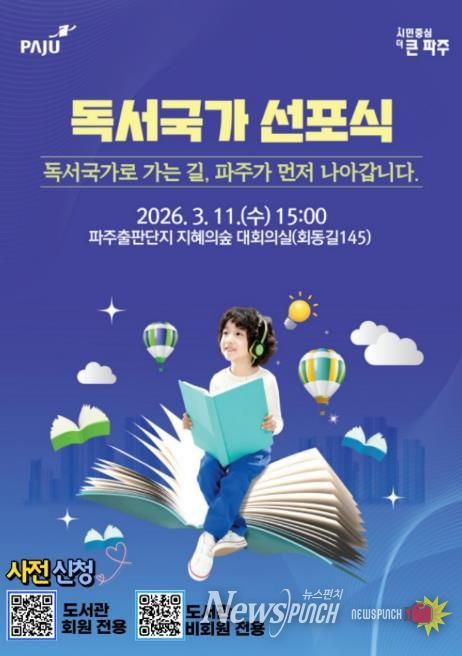 뉴스펀치 박상훈 기자 | 파주시는 오는 11일 15시, 파주출판도시 지혜의숲 대회의실에서 ‘파주시 독서국가 선포식’을 개최하고 책 읽는 도시를 넘어 ‘독서국가’로 나아가기 위한 힘찬 출발을 알린다.
