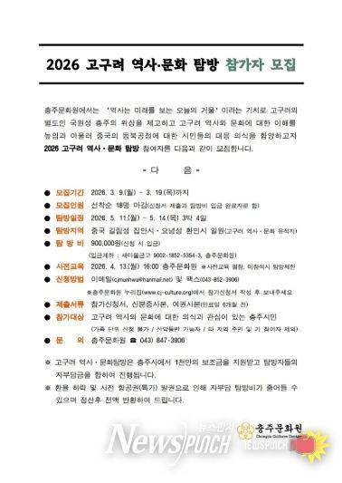 뉴스펀치 이현승 기자 | 충주문화원(원장 유진태)이 중국 길림성 집안시와 요녕성 환인시에 위치한 고구려 역사·문화 유적을 탐방할 답사자 18명을 선착순 모집한다.