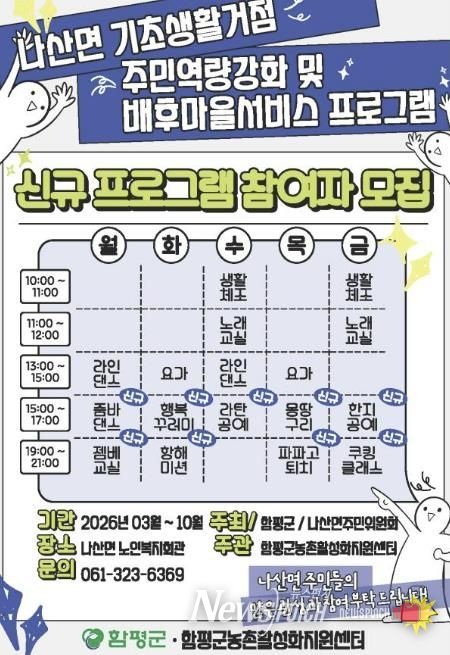 뉴스펀치 김용희 기자 | 전남 함평군은 “오는 10월까지 나산면 노인복지회관에서 나산면 주민을 대상으로 주민역량강화 및 배후마을 서비스 프로그램을 운영한다”고 9일 밝혔다.