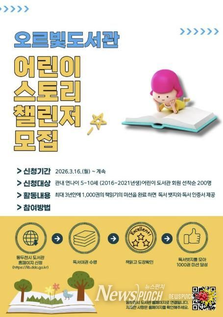 뉴스펀치 박상훈 기자 | 동두천시 도서문화사업소는 3월 16일부터 관내 5-10세 어린이를 대상으로 ‘어린이 스토리 챌린저’ 참여자를 모집한다고 밝혔다. 이번 사업은 어린이의 자발적인 독서 습관 형성과 ‘책 읽는 동두천’ 분위기 조성 및 독서문화 확산을 위해 마련했다.