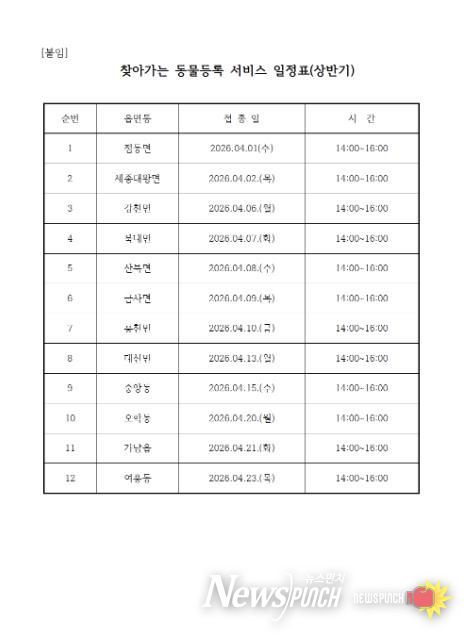 이번 서비스는 춘계 광견병 예방접종 기간에 맞춰 진행되며, 읍·면·동별 지정된 운영 일정(별첨)에 따라 행정복지센터 접수 창구를 방문해 신청서를 작성하면 된다. 동물등록은 외장형 무선식별장치를 부착하게 되며, 반려동물 소유주는 3,000원의 수수료를 납부하면 된다.