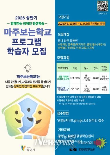 뉴스펀치 박상훈 기자 | 광명시 평생학습원은 장애인 학습자의 자기 이해와 사회 참여 역량 강화를 위한 평생학습 프로그램 ‘마주보는학교’의 상반기 수강생을 오는 24일까지 모집한다.