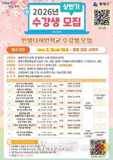 접수는 3월 16일 오전 10시부터 시작되며, 동래구 평생학습관 누리집을 통해 온라인으로 신청할 수 있다.