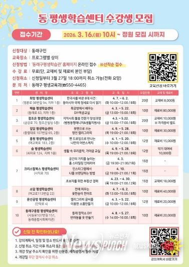 뉴스펀치 김윤걸 기자 | 부산 동래구는 오는 4월부터 6월까지 동별 평생학습센터에서 다양한 평생교육 프로그램을 운영하고 수강생을 모집한다고 밝혔다. 이번 프로그램은 구민들에게 생활권 내 평생학습 기회를 제공하기 위해 마련됐다.
