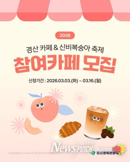 뉴스펀치 박세훈 기자 | (재)경산문화관광재단(이사장 조현일)은 오는 6월 27일부터 7월 1일까지 개최되는'2026 경산 카페 & 신비복숭아 축제'를 함께 이끌어 갈 관내 참여 카페를 모집한다고 밝혔다.
