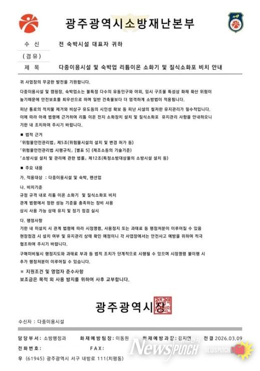 지난 9일 광산구 송정동에서는 한 숙박시설 관계자가 송정119안전센터를 방문해 ‘숙박시설 자동소화장치 설치 안내’ 공문 발송 여부를 문의했다.