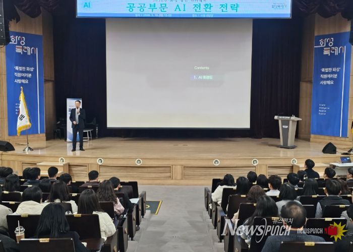 뉴스펀치 박상훈 기자 | 화성특례시는 10일 시청 대강당에서 인공지능(AI) 기술을 행정 전반에 적극 활용하기 위해 전 직원을 대상으로 AI 전환(AX) 교육을 실시했다.