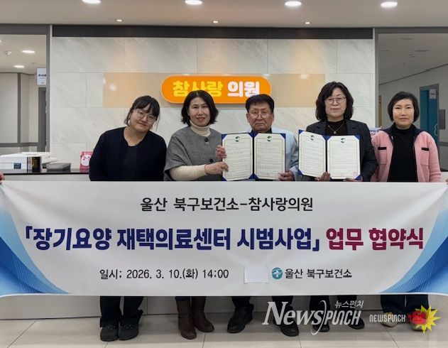 뉴스펀치 김윤걸 기자 | 울산 북구보건소는 10일 보건소 소회의실에서 참사랑의원과 장기요양 재택의료센터 운영을 위한 업무 협약을 체결했다.