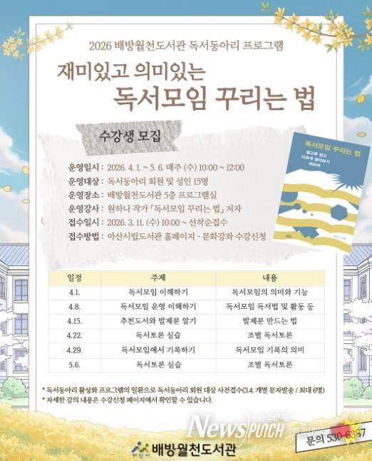 뉴스펀치 이현승 기자 | 배방월천도서관은 시민들의 자발적인 독서 활동을 지원하고 지역 독서공동체 문화를 활성화하기 위해 독서동아리 프로그램 ‘재미있고 의미 있는 독서 모임 꾸리는 법’을 운영한다.