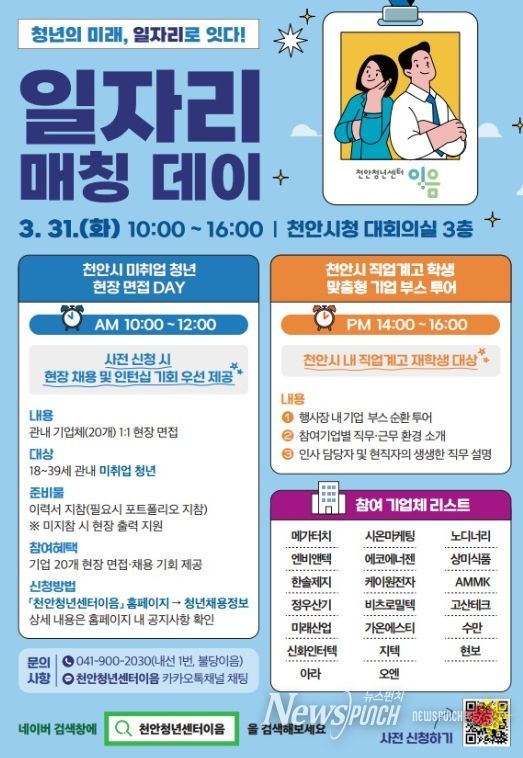 뉴스펀치 강영선 기자 | 천안시가 ‘2026년 청년 일자리 매칭데이’ 참여자를 모집한다고 11일 밝혔다.