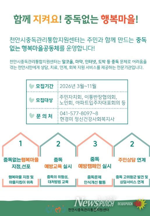 뉴스펀치 이현승 기자 | 천안시중독관리통합지원센터는 올해 ‘함께 지켜요! 중독없는 행복마을’ 사업을 확대 추진한다고 11일 밝혔다.