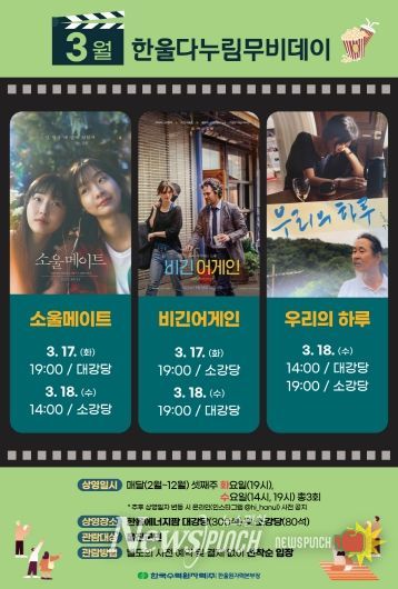 3월에는 우정·관계를 주제로 '우리의 하루'·'소울메이트'·'비긴어게인'을 상영한다. 각 작품은 삶의 다양한 순간 속에서 이어지는 우정·관계의 의미를 돌아보게 하는 이야기를 담고 있어 관객들에게 잔잔한 공감과 여운을 전할 것으로 기대된다.