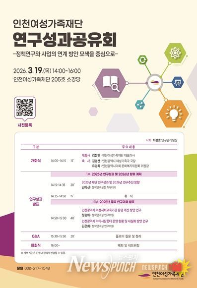 뉴스펀치 정홍균 기자 | 인천여성가족재단은 오는 3월 19일 2층 소강당에서 연구성과공유회를 개최한다.