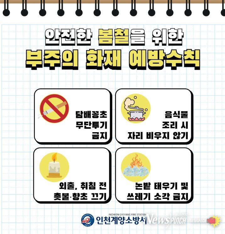 뉴스펀치 정홍균 기자 | 계양소방서는 봄철 화재예방대책의 일환으로 건조한 날씨와 야외활동 증가에 따라 부주의로 인한 화재 발생 위험이 높아짐에 따라 시민들의 각별한 주의를 당부한다고 12일 밝혔다.