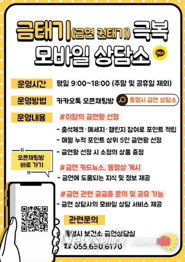 뉴스펀치 박세훈 기자 | 통영시는 금연 시도자들이 겪는 이른바 ‘금태기(금연 권태기)’를 효과적으로 극복할 수 있도록 돕는 ‘모바일 금연 상담소’를 올해 확대 운영한다고 12일 밝혔다.