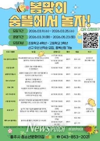 뉴스펀치 이현승 기자 | 충주시 청소년문화의집 숨&뜰에서 ‘봄맞이 숨뜰에서 놀자!’로 3월 11일부터 3월 25일까지 충주시 관내 초등학생 4학년부터 고등학생 3학년을 대상으로 신규 참가자를 우선으로 선착순 모집하고 있다.
