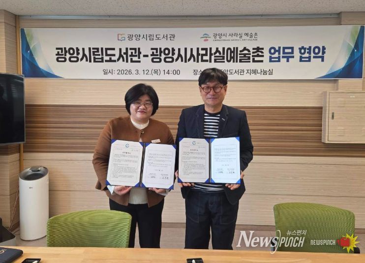 뉴스펀치 김용희 기자 | 광양시립도서관과 광양시사라실예술촌은 지난 3월 12일 오후 2시 광양중앙도서관에서 시민의 문화예술 향유 기회를 넓히고 지역 문화기관 간 협력 기반을 강화하기 위한 업무협약을 체결했다.