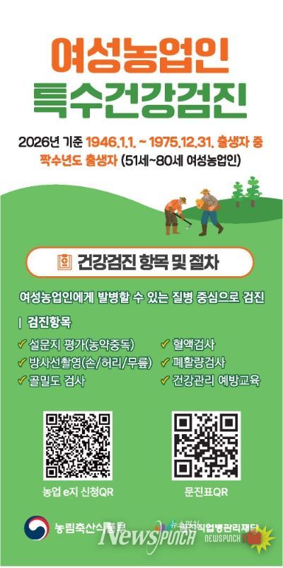 뉴스펀치 김용희 기자 | 옹진군은 올해 처음으로 여성농업인의 건강권 보호를 위한'여성농업인 특수건강검진사업'을 본격 시행한다고 밝혔다.
