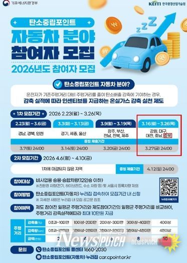 올해 모집 규모는 총 2,267대이며, 3월 16일부터 26일까지 선착순으로 접수한다. 참여를 희망하는 시민은 해당 기간에 탄소중립포인트(자동차) 누리집에 접속해 직접 회원가입 후 신청하면 된다.