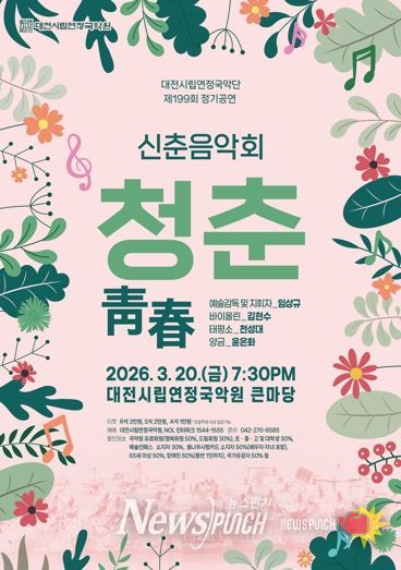 뉴스펀치 이현승 기자 | 대전시립연정국악단은 20일 오후 7시 30분, 국악원 큰마당에서 제199회 정기공연 신춘음악회 ‘청춘(靑春)’을 개최한다.