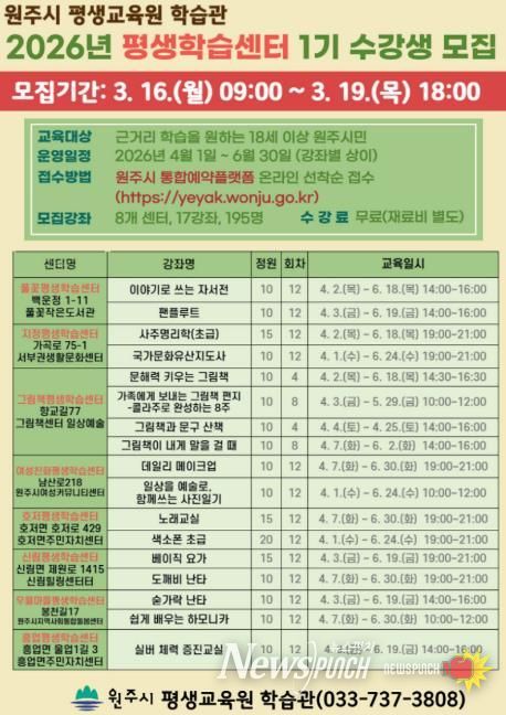 뉴스펀치 조평훈 기자 | 원주시 평생교육원 학습관은 3월 16일부터 19일까지 2026년 평생학습센터 1기 수강생을 모집한다.